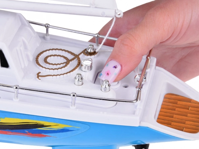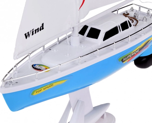Stilvolles RC-Segelboot in Blau-Weiß mit realistischen Segeln bringt Kindern jede Menge Wasserspaß. Gesteuert wird es mit einer Steuerrad-Fernbedienung auf der Frequenz 27 MHz; außerdem dabei: doppelte Schiffsschrauben, Stabilisierungskiel, verchromte Relings und ein Ständer zum Ausstellen. Im Lieferumfang enthalten sind ein ladefähiger Akku, USB-Kabel und Ersatzpropeller.