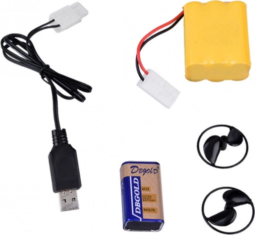 • Komplett-Set: Steuerrad-Fernbedienung, Akku, 9V-Batterie, USB-Kabel, Ersatzpropeller und Ständer.