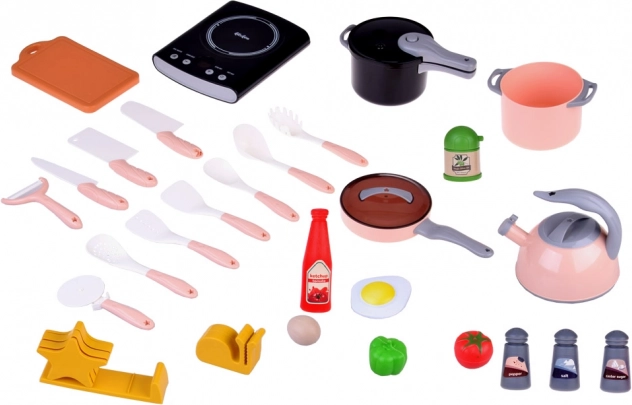 Das Set enthält alles, was kleine Köchinnen und Köche brauchen: Kocher, Geschirr, Küchenwerkzeuge sowie Lebensmittel und Gewürze.