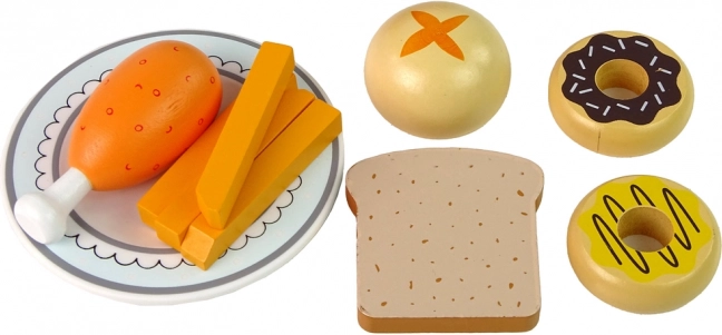 Teller, 2× Donut, Brötchen, Brotscheibe, 4× Pommes und Hähnchenkeule – alles bereit für kreatives Servieren und lustige Szenen.