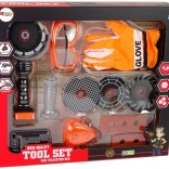 Enthalten sind Brille, Maske und Handschuhe. Kinder lernen spielerisch die Grundlagen der Sicherheit bei Werkstatttätigkeiten.