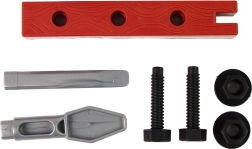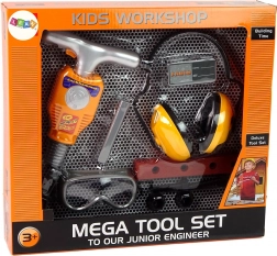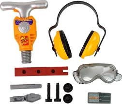 Das gesamte Set ist in einer Box mit transparenter Sichtscheibe verpackt, die die Aufmerksamkeit der Kinder auf sich zieht. Das Set enthält Schrauben, die mit dem Hammer und dem passenden Bit eingeschraubt werden können. Ein weiterer Vorteil dieses Sets ist, dass der Hammer nach dem Einlegen der Batterien und dem Drücken der orangefarbenen Taste am Griff in charakteristischer Weise zu arbeiten beginnt. Zusätzlich kann das Kind einen Gehörschutz und eine Schutzbrille aufsetzen, was noch mehr Spaß, aber auch Sicherheit beim Einsatz des Presslufthammers bietet. Alle Teile bestehen aus Kunststoff und sind sicher für Kinder.