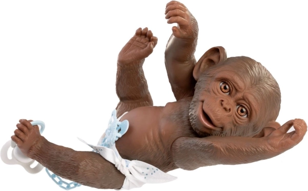 Fröhliches und realistisches Affenbaby mit Vinylkörper, das gebadet werden kann. Jeder Detail ist glaubhaft eingefangen, einschließlich eines lustigen Schnullers als Zubehör.