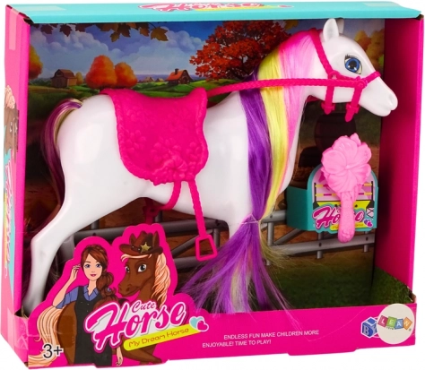 Entdecken Sie die Magie der Reiterwelt mit der weißen Pferdefigur, die durch detailreiche Gestaltung und Zubehör begeistert. Kinder können mit der beiliegenden Bürste kreative Frisuren stylen und das Spiel mit verstellbarem rosa Sattel und Zaumzeug ergänzen. Das Spielzeug fördert die Feinmotorik, Vorstellungskraft und Fürsorgefähigkeiten.