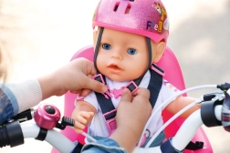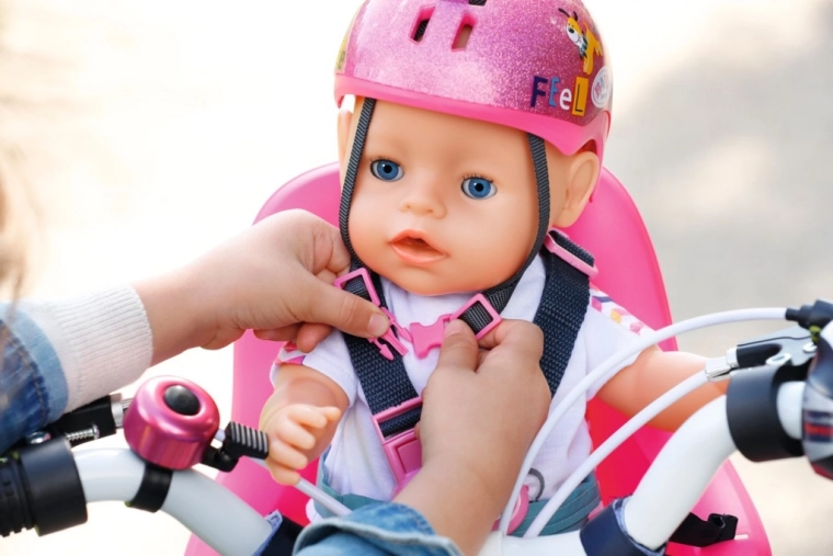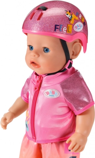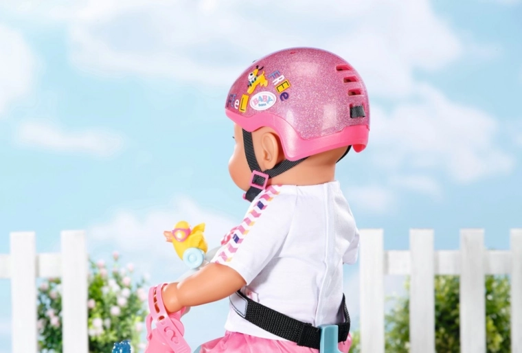 Der Helm überzeugt mit leuchtendem Pink, Glitzer und lustigen Aufklebern – ideal für stylische Ausflüge der BABY born Puppe.