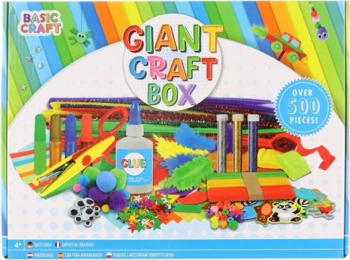 Das große Kreativset enthält Perlen, Wackelaugen, bunte Sternchen, farbiges Krepppapier, Klebstoff, farbige Glitzerkleber, Glitzer, flauschige Stoff-Pompons, Scheren mit Zackenmuster, bunte Federn, bunte Holzstäbchen und farbige Pfeifenputzer. Die Packung enthält insgesamt über 500 Teile. Verpackt in einer Schachtel. Verpackungsmaße ca. 40×30×5 cm. Alter 4+