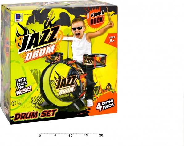 Dieses Jazz Drum Schlagzeug-Set ist ideal für angehende Musiker, die ihren Rhythmus entdecken möchten. Es beinhaltet 3 Trommeln, darunter eine Bassdrum mit Fußpedal und einem Metallbecken.