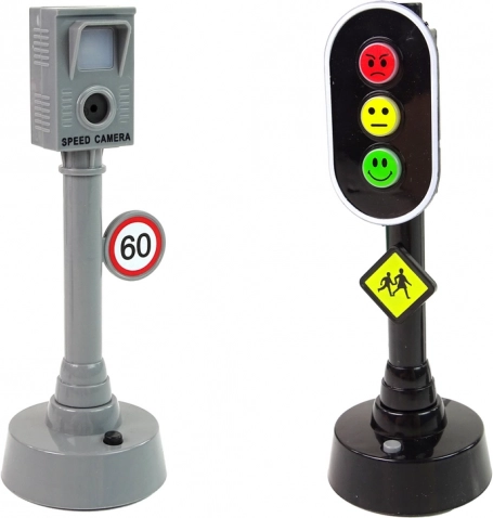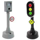Mit Hilfe der Verkehrsschilder können Kinder eigene Straßen und Zonen erstellen, auf denen sie mit ihren Autos fahren können. Es gibt auch eine Geschwindigkeitskamera, die auf Geschwindigkeitsüberschreitungen hinweist.