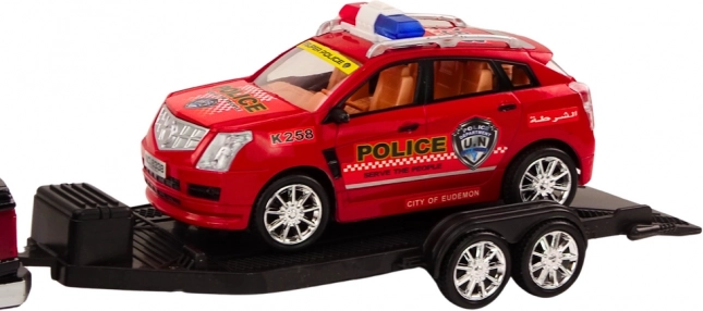 Das robuste rote Fahrzeug mit POLICE-Aufdruck und Lichtleiste (Dekor) meistert auch anspruchsvolle Missionen. Es rollt leicht vom Anhänger und ist sofort einsatzbereit.