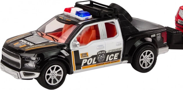Der schwarze Pick-up zieht einen Anhänger mit rotem Geländewagen – die perfekte Kombination für Einsatz-, Abschlepp- und Verfolgungsszenen. Der Anhänger lässt sich jederzeit abkoppeln.