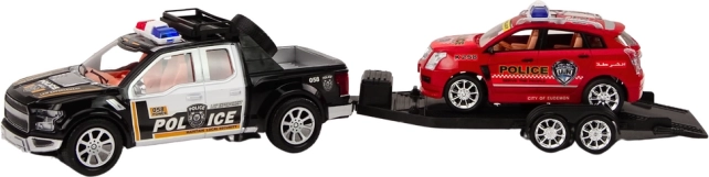 Dieses Polizei-Set kombiniert einen robusten schwarzen Pick-up mit Abschleppanhänger und ein rotes geländegängiges Polizeiauto. Große Räder sorgen für Stabilität; markante POLICE-Schriftzüge und die Lichtleiste (Dekor) verleihen einen realistischen Look. Der Anhänger ist abnehmbar und der Geländewagen kann die Rampe leicht auf- und abfahren – die Fahrzeuge lassen sich gemeinsam oder separat verwenden.