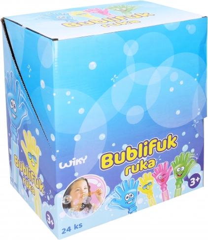 Seifenblasenstab in Handform 31 cm mit einem Volumen von 67 ml in vier Farben. Ideal für lustige Kinderbedürfnisse.