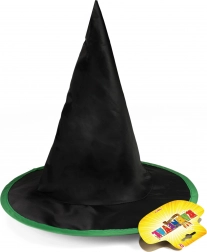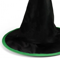 Perfekt für jedes Halloween-Kostüm kleiner Zauberer. Hergestellt aus hochwertigem schwarzem Taffeta, ist der Hut mit einem auffälligen grünen Saum verziert, der Aufmerksamkeit erregt.