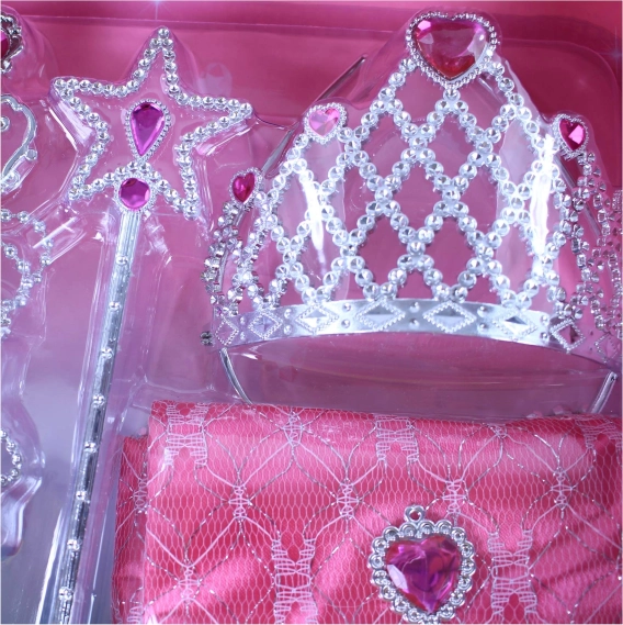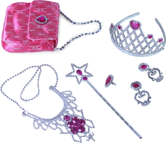 Entfache die Fantasie der Kinder mit dem zauberhaften Prinzessinnen-Set, das jedes Mädchen in eine echte Prinzessin verwandelt. Im Set enthalten sind Krone, Ohrringe, Halskette, Zauberstab und eine Handtasche in wunderschönem Rosa – ideal für Verkleidungen, Karneval und das Spielen zu Hause.