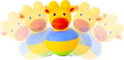 Dank des abgerundeten Sockels richtet sich das Spielzeug immer wieder auf, was das Kind zu wiederholtem Erkunden motiviert und sowohl die Feinmotorik als auch die Hand–Auge-Koordination trainiert. Die Farben können von der Abbildung abweichen.