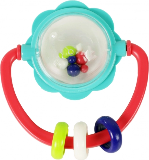 Farbenfrohe Rassel in Blumenform mit Kügelchen in der Mitte für Babys ab der Geburt. Fördert die Feinmotorik und die visuelle Wahrnehmung.