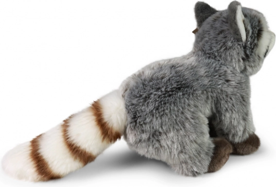 Der Plüsch-Waschbär verfügt über detaillierte Merkmale einschließlich eines gestreiften Schwanzes und kontrastreicher Fellmuster, die sein realistisches Aussehen betonen.