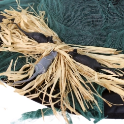 Der Hut ist mit grünem Schleier und Spinnen verziert, was ihm ein gruseliges und zugleich stilvolles Aussehen verleiht.