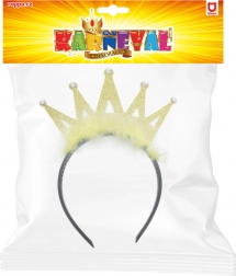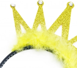 Elegantes Kinderstirnband mit goldener Krone, verziert mit Federn und glitzernden Steinen, ist das perfekte Accessoire für ein Karnevalskostüm. Schönes Design zieht die Aufmerksamkeit auf sich und bequemes Tragen ist garantiert.