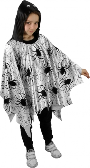 Suchen Sie ein einfaches und effektvolles Kostüm für Kinder? Dieser leichte Umhang/Poncho mit schwarzem Druck von Spinnen und Spinnennetzen auf weißem Grund fällt sofort ins Auge. Dank des lockeren Schnitts lässt er sich bequem über den Kopf anziehen und ermöglicht uneingeschränkte Bewegungsfreiheit beim Spielen, Tanzen und in Umzügen.