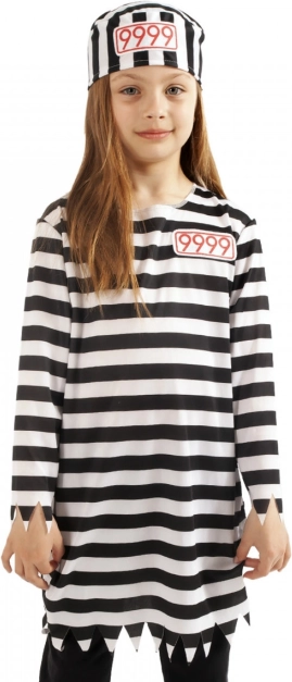 Gönnen Sie der kleinen Fashionista ein originelles Kostüm für jede Kostümparty. Dieses Kinderkostüm Gefangene im klassischen schwarz‑weißen Streifen passt Kindern mit einer Körpergröße von 105–116 cm und bietet dank weichem Textil angenehmen Tragekomfort. Das Set enthält ein langes Shirt und eine Mütze mit der Nummer 9999, die den authentischen Look abrunden.