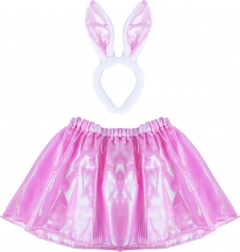 Niedliches Kostüm für Kinder von 3 bis 7 Jahren, das einen glänzenden rosa Rock und einen Haarreif mit rosa Hasenohren umfasst. Ideal für Spaßveranstaltungen und Verkleidungsspiele.