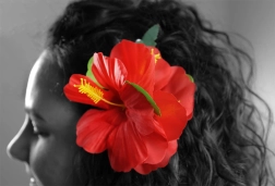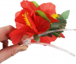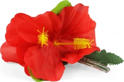 Die Hibiskusblüte aus Textil und Kunststoff wirkt sehr realistisch und belebt jede Frisur.