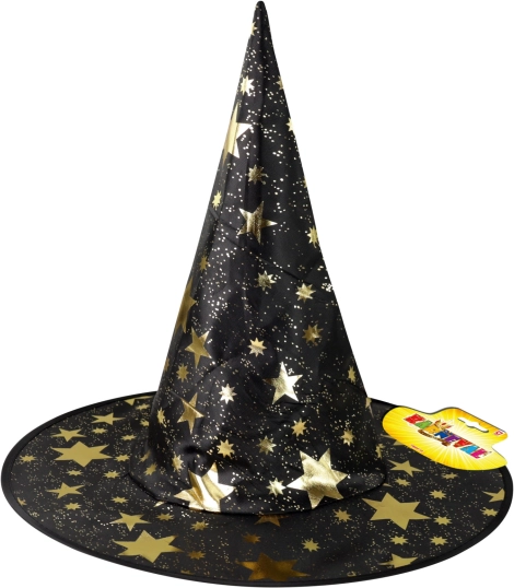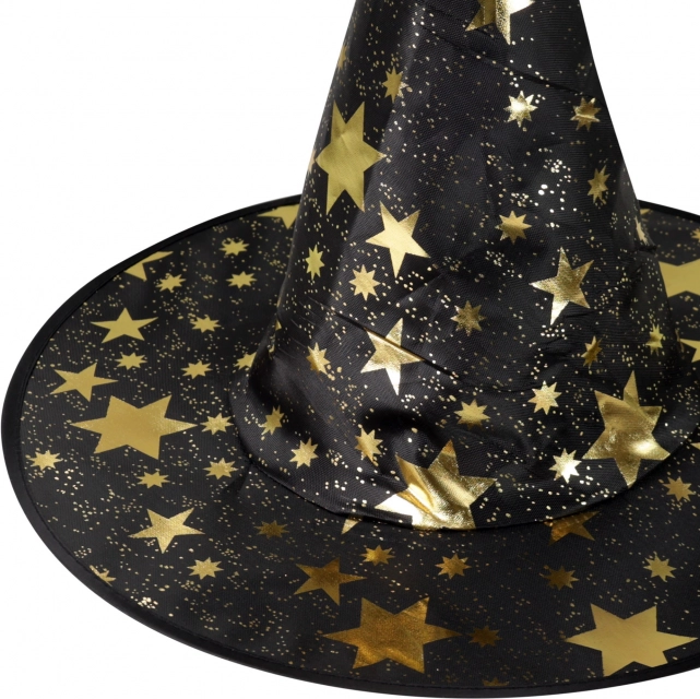 Stilvoller Kinder-Hexenhut in Schwarz mit einem Muster aus goldenen Sternchen verleiht jedem Kostüm eine magische Note. Ideal für Karneval, Maskenball und Halloween. Das leichte Textilmaterial sorgt für angenehmen Tragekomfort und eine stabile Form. Geeignet für Kinder ab 3 Jahren.