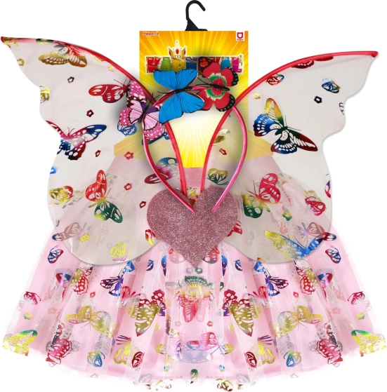Verwandeln Sie Ihre kleine Prinzessin in einen bezaubernden Schmetterling mit diesem großartigen Kostüm. Der rosa Rock mit bunten Schmetterlingen wird perfekt durch ein dekoratives Stirnband und Schmetterlingsflügel ergänzt. Perfekte Wahl für Rollenspiele oder Karnevalfeiern.