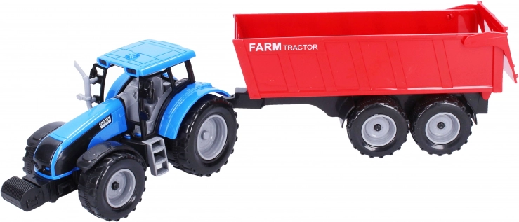 Leistungsstarker Traktor mit Anhänger mit einer Länge von 42 cm, ideal für kleine Landwirte. Antrieb durch Schwungrad und eine öffnende Hinterseite des Anhängers bieten Freude und realistisches Spiel. Mehr anzeigen