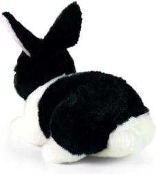 Das schwarz‑weiße Häschen wirkt lebensecht und lädt dank des extra weichen Materials zum Kuscheln ein.