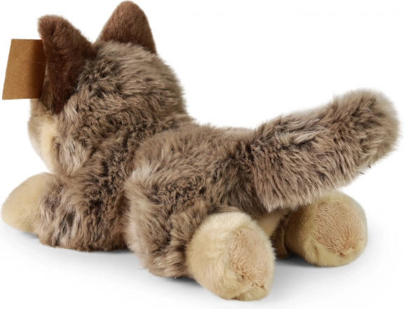 Der kuschelweiche, liegende Wolf wirkt dank detaillierter Merkmale und hochwertigem Material lebensecht. Die Füllung aus recycelten PET‑Flaschen ist haptisch nicht von klassischer Füllung zu unterscheiden, sicher und für die Kleinsten zertifiziert.
