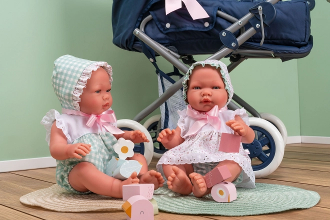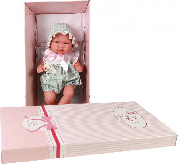 Pablo trägt einen stilvollen grün-weißen Sommeroverall ohne Ärmel mit kurzen Hosenbeinen, verziert mit weißer Spitze, ergänzt durch eine Bindemütze. Er liegt auf einem weichen Kissen mit Decke und hat einen Schnuller an einer Kette, der in den Mund eingesetzt werden kann und sicher hält. Der Hersteller ASI (Asivil) ist eine spanische Familienmarke mit mehr als 50 Jahren Tradition, die auf 100 % lokale Handwerksfertigung und strenge europäische Standards setzt.