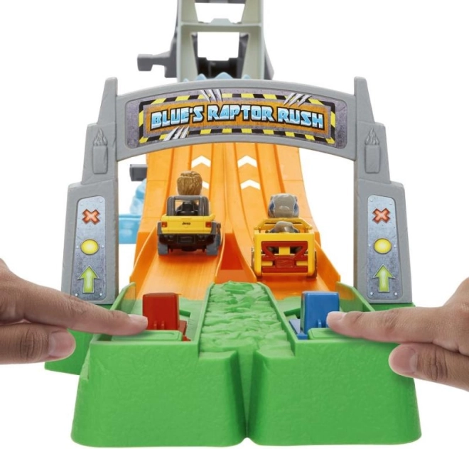 Erleben Sie echtes Rennfieber dank der Fahrzeuge Blue Raptor und Owen mit integrierten Fahrerfiguren.