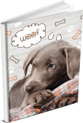 Beliebt bei Hundefreunden, dieses Erinnerungsbuch mit spielerischen Illustrationen von Knochen und Pfoten und dem Schriftzug 'WOOF' erhellt jeden Tag.