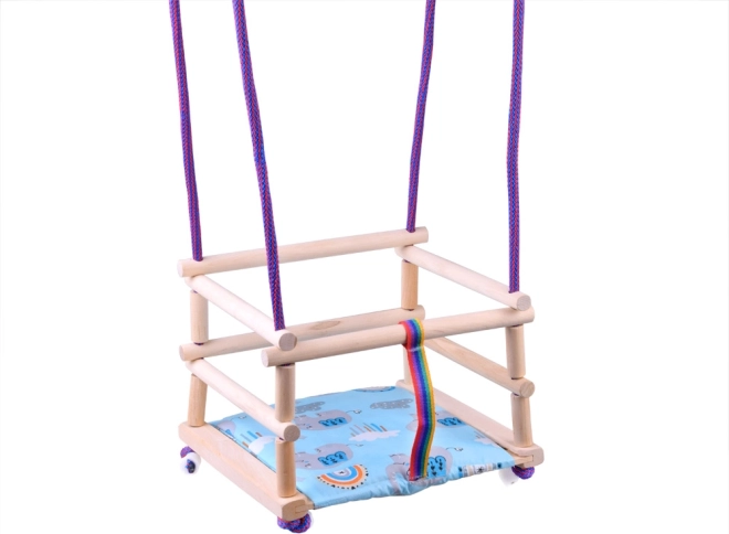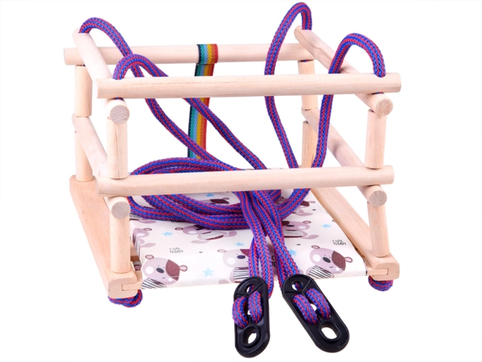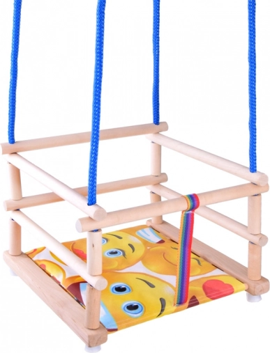 Bunte Holzschaukel zum Aufhängen. Hergestellt aus Buchenholz, lackiert mit umweltfreundlichem Wasserlack. Für Sicherheit sorgt ein Sicherheitsgurt, der das Kind vor dem Herausfallen aus der Schaukel schützt. Die Seile enden mit Kunststoffaufhängern, die eine schnelle Montage oder Demontage der Schaukel von Haken ermöglichen. Zur Schaukel gehört ein weiches Sitzkissen (Polster). Jede Schaukel enthält eine Anleitung für sicheren Gebrauch und Pflege. Die Schaukel bereitet Ihrem Kind viel Freude. Abmessungen der Schaukel: