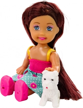 Mini-Puppe mit langen Haaren und Tierchen im bunten Outfit