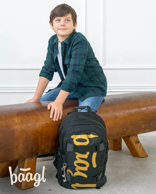 Stilvolles Schulset Baagl Skate Gold enthält Rucksack, Federmäppchen, Turnbeutel, Mappen für Hefte und Geldbörse. Bietet ergonomisches Design und praktische Funktionen für einen angenehmen und sicheren Schultag.