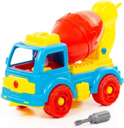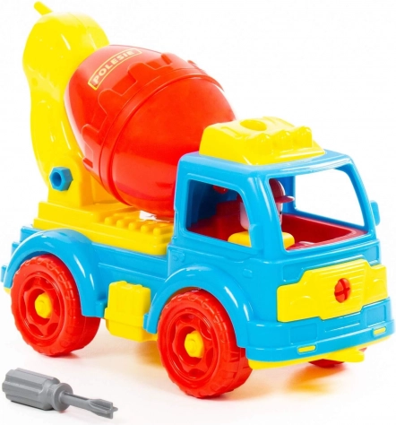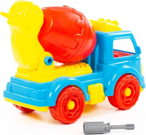 Mit dem beiliegenden Schraubendreher zerlegen und montieren Kinder den Betonmischer immer wieder neu – so trainieren sie Feinmotorik und technisches Denken.