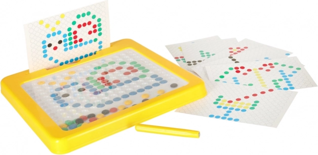 Die magnetische Zeichentafel mit Mosaik ist ein hervorragendes didaktisches Hilfsmittel, inspiriert von Montessori-Prinzipien. Kinder ziehen mit dem Magnetstift farbige „Knöpfe“ in der Platte an und verschieben sie, um einfache oder komplexere Motive zu legen. Die beiliegenden Vorlagenkarten erleichtern den Einstieg und liefern Inspiration.