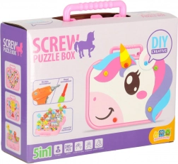 Das Set ist in einem robusten Kunststoffkoffer mit perforierter Platte zum Schrauben untergebracht. Dank der umfangreichen Ausstattung und Aufklebern mit Einhornmotiven macht das Spielen allein oder in der Gruppe besonders viel Spaß.