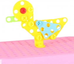 Leichter rosa Koffer mit Lüftungsöffnungen und Tragegriff hält alle Teile beisammen und dient als Arbeitsbasis zum Schrauben.