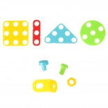 Die perforierte Platte und bunte Formen ermöglichen das Legen von Mustern, Bildern und einfachen räumlichen Figuren – der Fantasie sind keine Grenzen gesetzt.