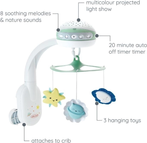 Das INFANTINO 3-in-1 Mobile wächst mit Ihrem Kind: vom rotierenden Bett-Mobile über den Projektor/die Lampe am Bett bis hin zum separaten Nachtlicht auf dem Tisch. Es projiziert beruhigende Sternenmuster und bietet eine Auswahl aus sechs Melodien und zwei Naturgeräuschen, die beim Einschlafen helfen und eine angenehme Abendroutine unterstützen.