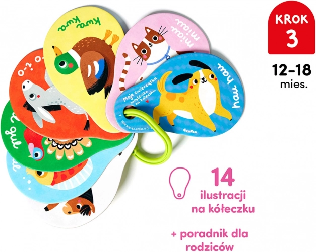 14 Bildillustrationen (7 beidseitig bedruckte stabile Karten), Verbindungsring, Elternratgeber
