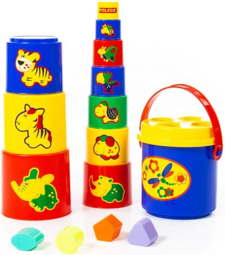 Das Spielzeug ist ein großartiger Begleiter für die Kleinsten und bringt ihnen mithilfe von Spiel und Bildern neue Tiere, Farben und Formen bei. Außerdem lässt sich die Pyramide nach dem Spielen einfach in dem beiliegenden Eimerchen verstauen.