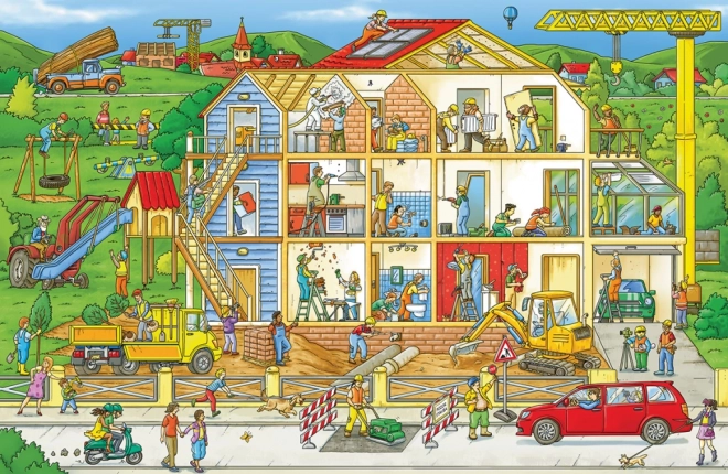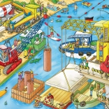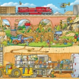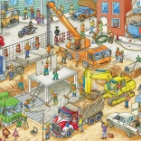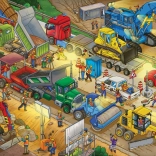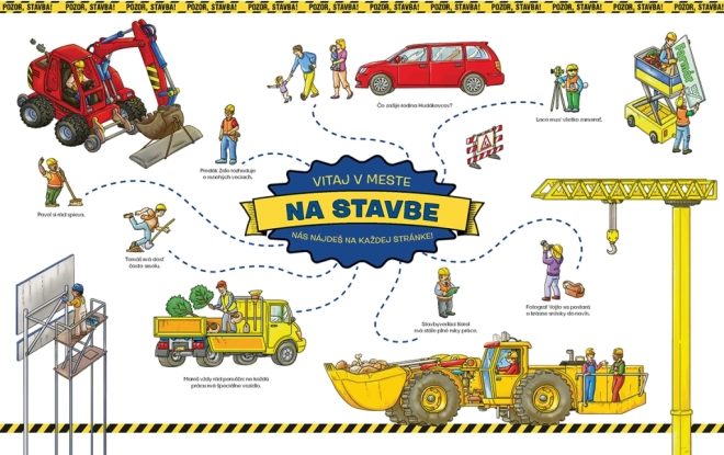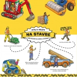 Das Buch enthält stark illustrierte Szenen, die die lebendige Umgebung der Baustelle mit verschiedenen Baumaschinen zeigen.