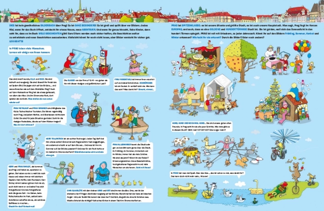 Entdecken Sie Prag durch Kinderaugen mit einem reich illustrierten Buch auf Deutsch. Kinder besuchen die Karlsbrücke, die Prager Burg, den Kleinseitner Ring, den Altstädter Ring mit der Astronomischen Uhr und die Stromovka – und unterwegs werden sie von witzigen Figuren und Prager Gespenstern begleitet. Die Bilder erzählen Geschichten selbst denen, die noch nicht lesen.