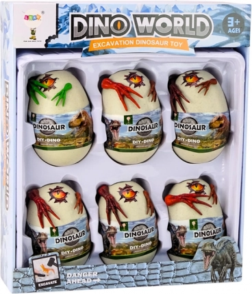 Die Box enthält sechs Eier mit Dinosauriern für kleine Forscher ab 3 Jahren. Jedes Ei verspricht eine neue Überraschung und eine weitere paläontologische Herausforderung.
