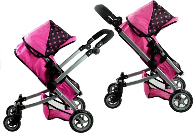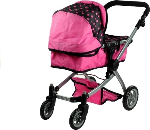 Der Puppenwagen Alice 2-in-1 überzeugt durch realistische Ausführung und vielseitiges Design. Im Handumdrehen verwandeln Sie ihn vom klassischen Wagen mit Wanne in einen Sportwagen. Die Kombination aus Rosa und Schwarz mit Punkten wirkt verspielt und modern, während der robuste Metallrahmen und hochwertige Bezüge für lange Haltbarkeit sorgen.
